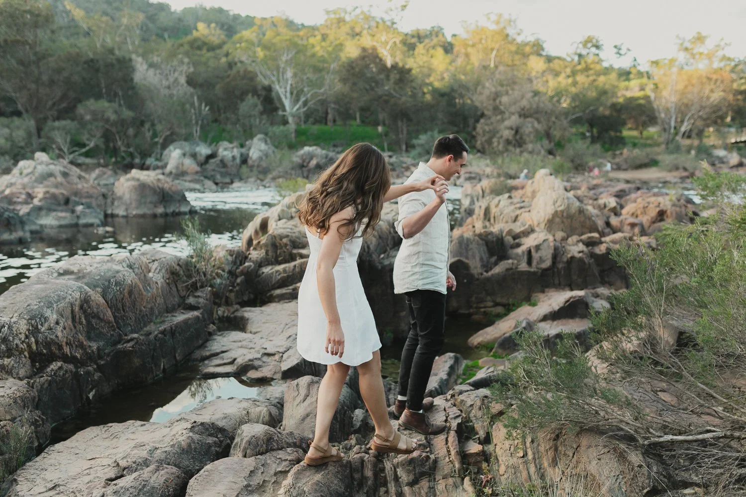 A couple holding hands walking through coastal vegetation with large rock formations and the ocean in the background